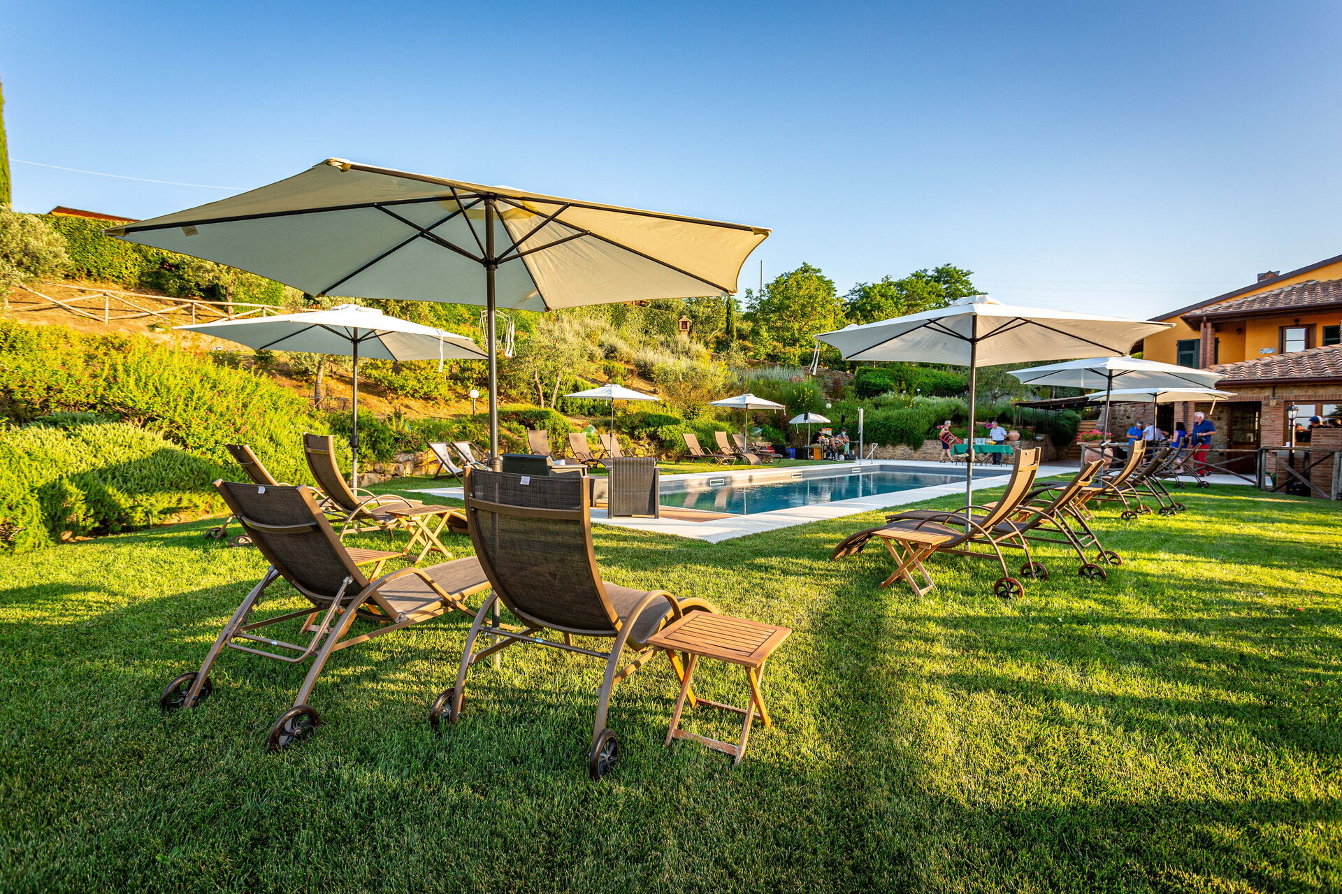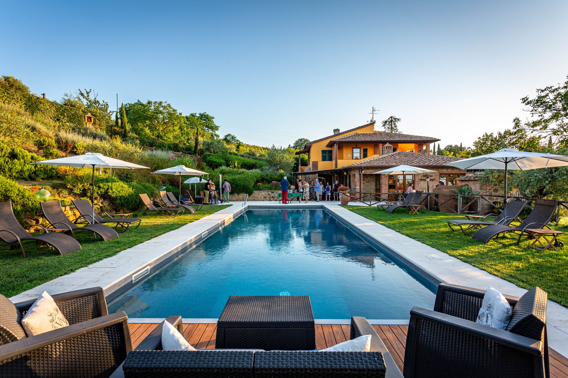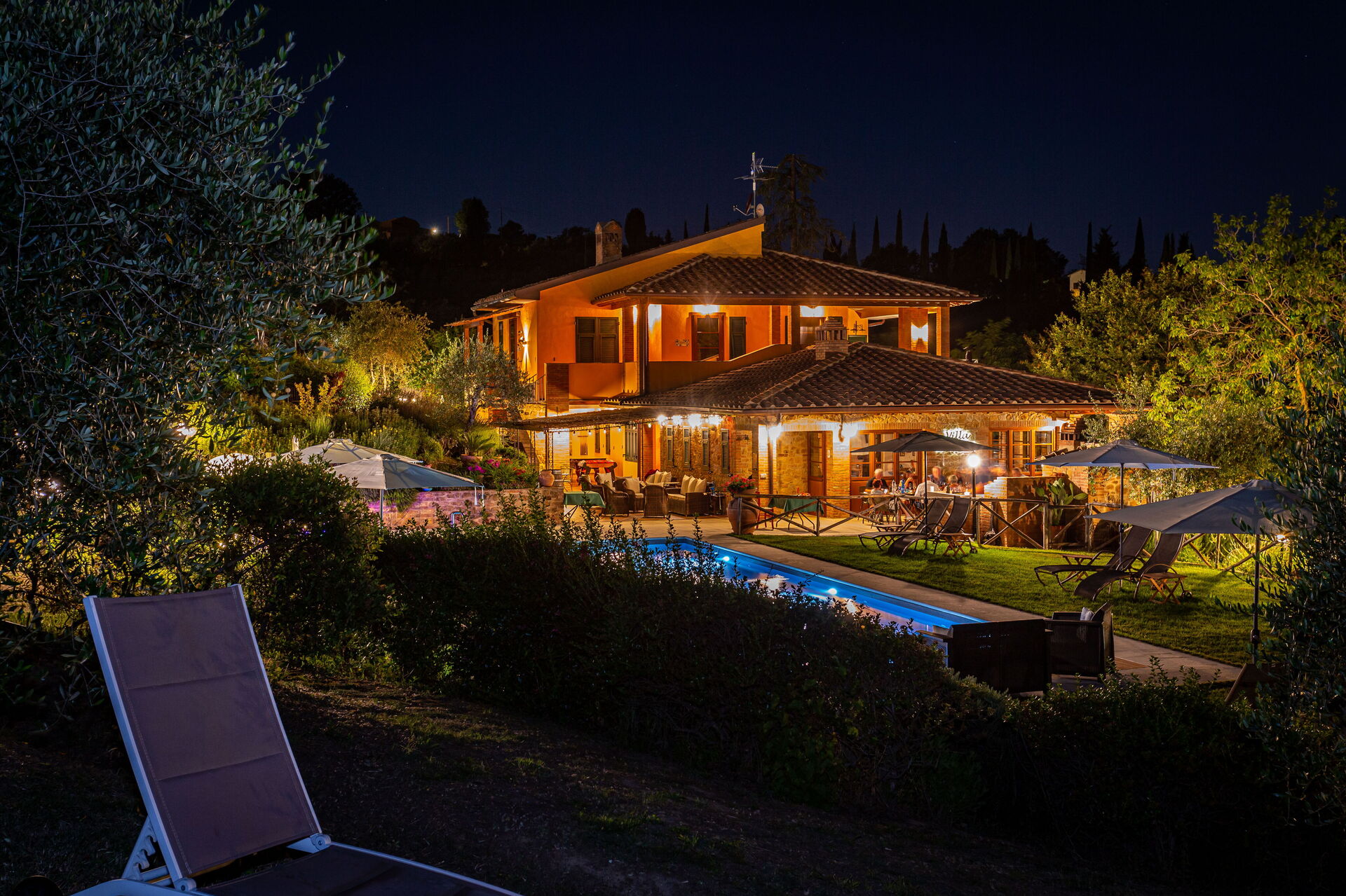 Ter beschikking van de gasten: grote, ingerichte buitenruimtes (ligbedden en parasols), panoramisch zwembad (15 x 5 m - diepte van 1,5 m tot 2 m) met gemakkelijke toegang, 6 slaapkamers met airconditioning, elk met een eigen badkamer en gemeubileerde buitenruimte; badkamer dicht bij het zwembad; buitendouche, relax - zones; barbecue en pizzaoven; groentetuin, tafeltennis, badminton, biljart,kinderspeelplaats . Wi-Fi internetverbinding beschikbaar, satelliet-tv, wasmachine; elektrisch laadstation; overdekte parkeerplaats op het terrein.