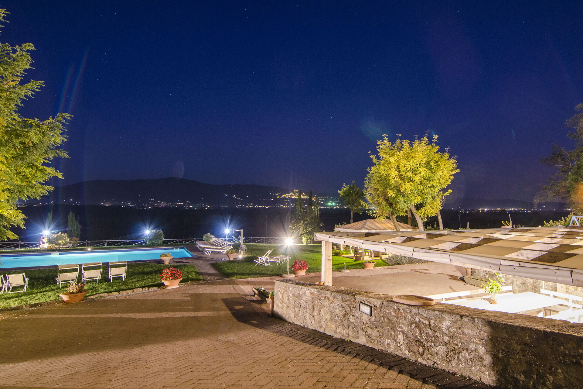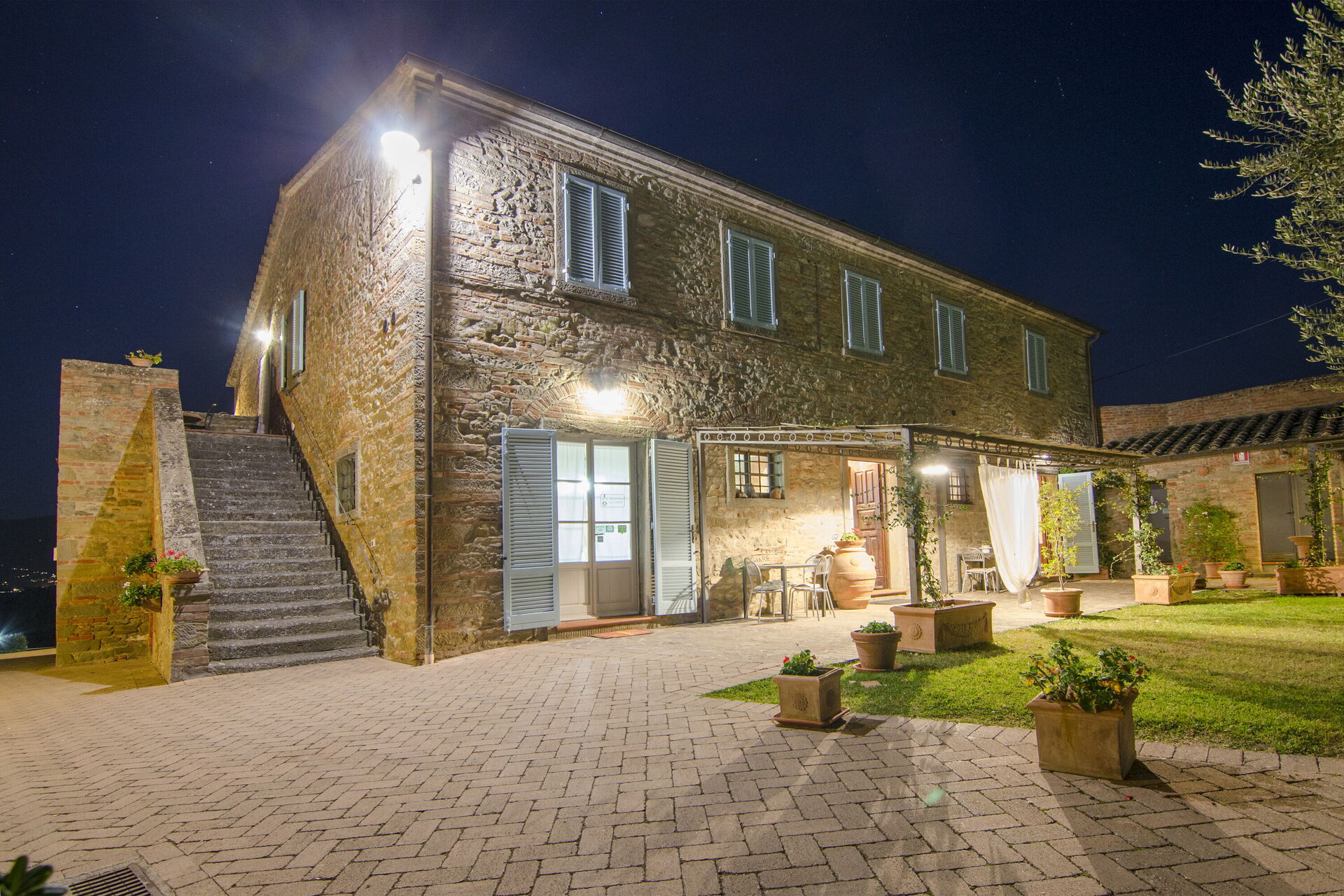 Eiendommen ligger i rolige omgivelser og fra huset har man panoramautsikt mot åsene rundt den vakre byen Cortona. Plasseringen er et perfekt utgangspunkt for utflukter til andre kjente steder i Toscana som Arezzo, Montepulciano, Pienza, samt Perugia og Assisi i Umbria.