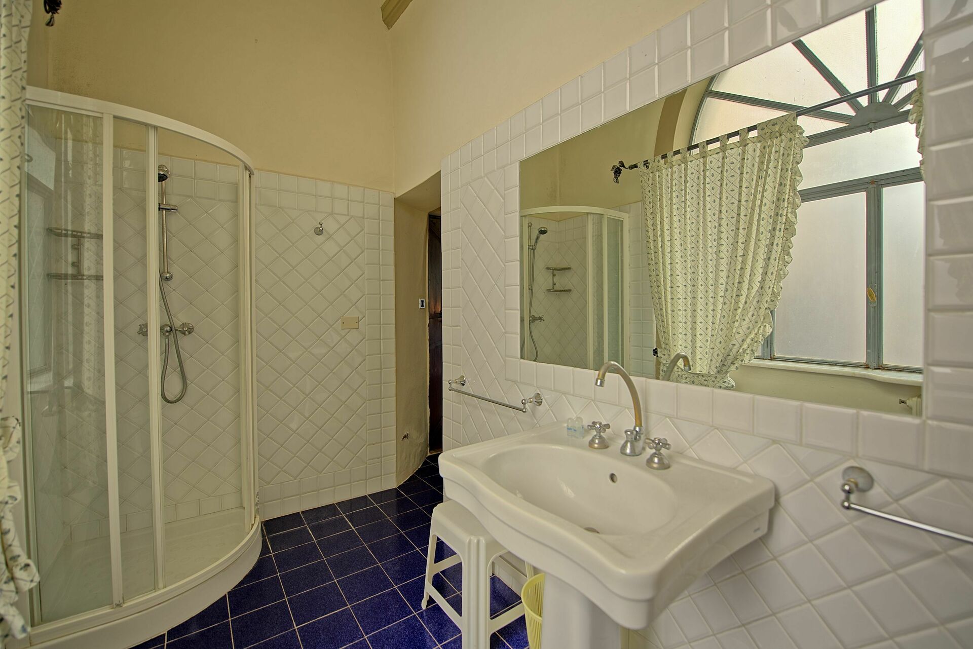 1-й высокий этаж: большая гостиная с большими подлинными гобеленами и обеденная зона, кухонный уголок и 2 односпальных дивана- кровати, спальня с двуспальной кроватью и антикварной мебелью и красивой люстрой из муранского стекла начала XVIII века, ванная комната с душевой кабиной.